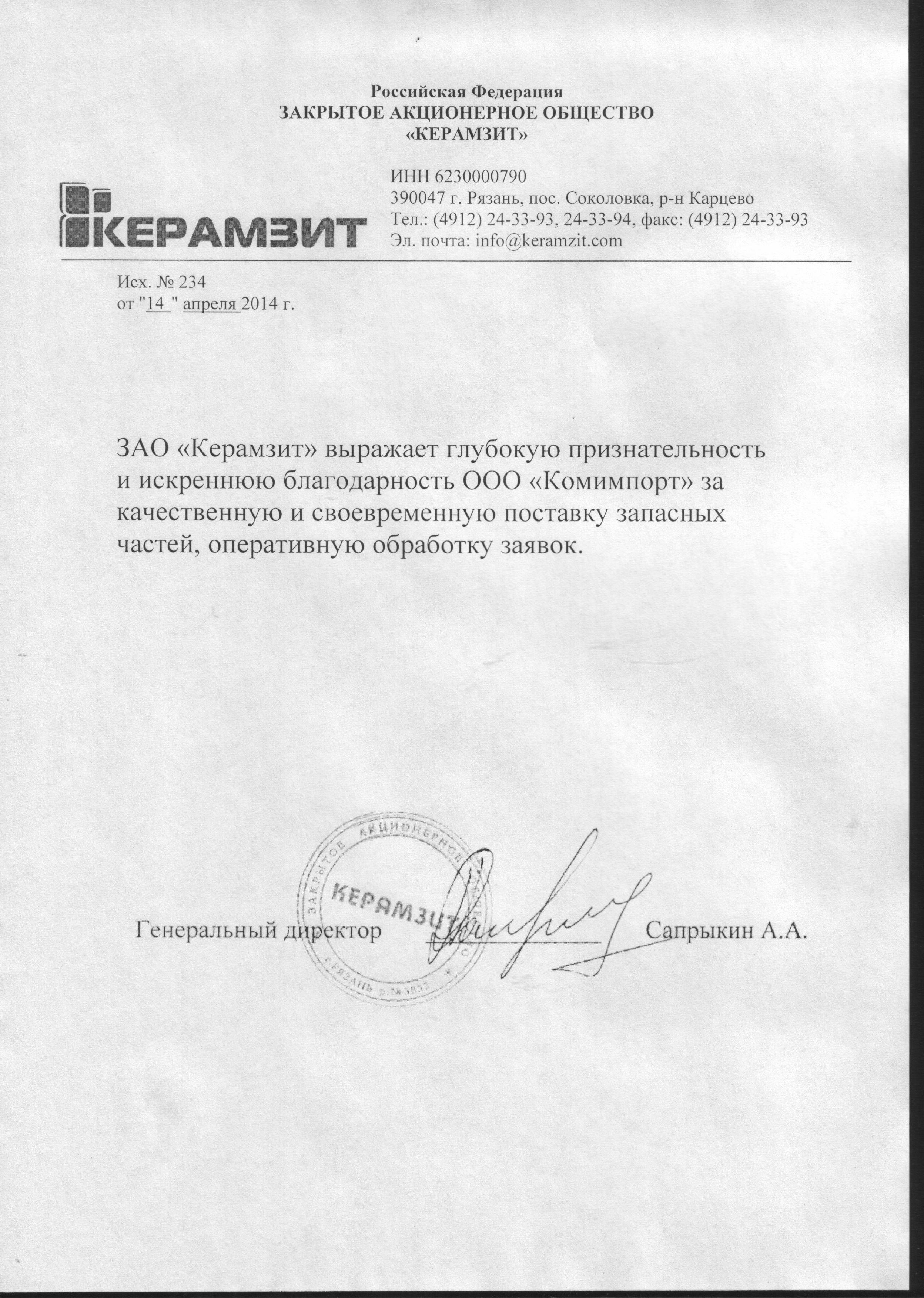 ЗАО «Керамзит» выражает глубокую признательность и искреннюю благодарность ООО «Комимпорт» за качественную и своевременную поставку запасных частей, оперативную обработку заявок.