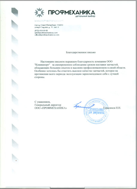 Настоящим письмом выражаем благодарность компании ООО «Комимпорт» за своевременное соблюдение сроков поставки запчастей, обладающих большим опытом и высоким профессионализмом в своей области. Особенно хотелось бы отметить высокое качество запчастей, которое на протяжении всего периода эксплуатации зарекомендовало себя с лучше стороны.